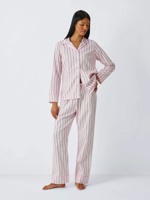 Mixed Stripe Button Through Brushed Cotton Long Pyjama Set, Red/Pink