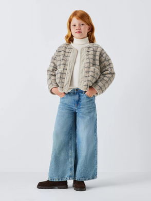 Kids' Check Borg Fleece Jacket, Cream, Grey