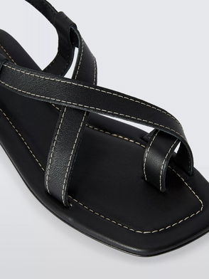 Larnce Leather Contrast Stitch Toe Loop Flat Strappy Sandals, Black
