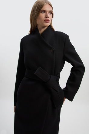 Wool Wrap Neck Tailored Belted Midi Coat