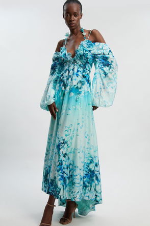 Balloon Sleeve Embroidered And Beaded Woven Maxi Dress
