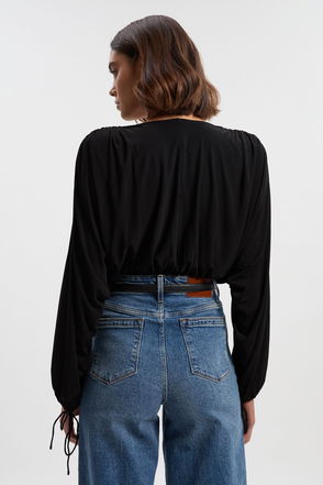 Stretch Drapey Crepe Ruched Plunge Neck Batwing Sleeve Bodysuit