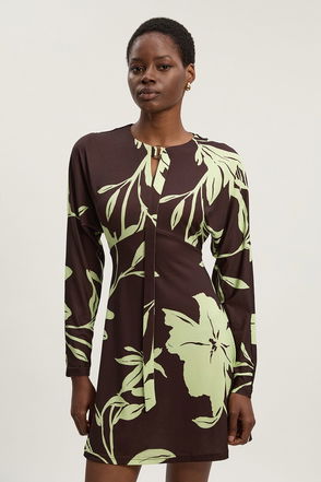 Floral Print Keyhole Tie Detail Crepe Long Sleeve Mini Dress