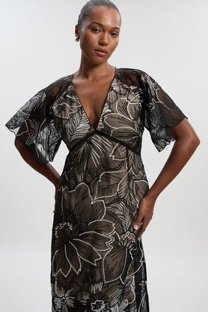 Plus Size Hand Embroidered And Sequin Organdie Deep V Woven Maxi Dress