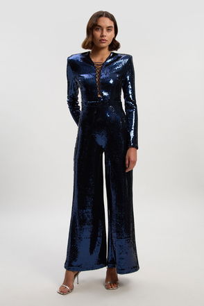 Petite Sequin Power Mesh Lace Up Detail Long Sleeve Jumpsuit