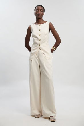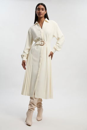 Tailored Linen Tab Waist Detail Full Skirt Midi Dress