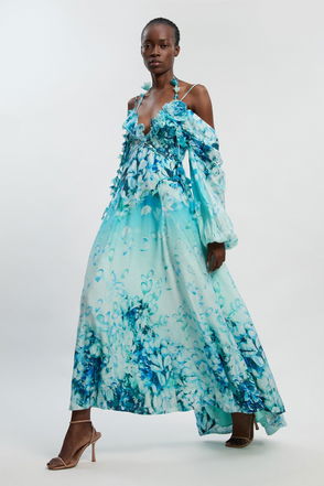 Floral Applique Printed Cold Shoulder Woven Maxi Dress