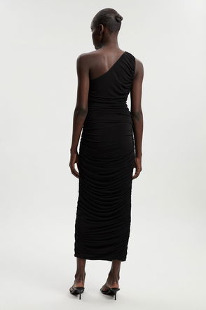 One Shoulder Drapey Crepe Trim Detail Ruched Maxi Dress