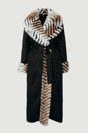 Faux Shearling Contrast Collar & Cuff Belted Maxi Coat
