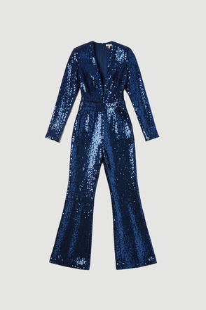Petite Sequin Power Mesh Lace Up Detail Long Sleeve Jumpsuit