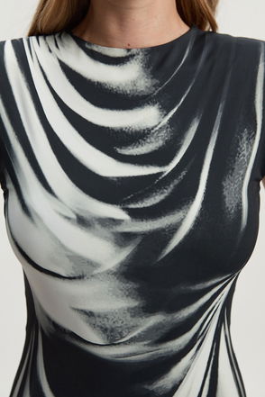 Abstract Zebra Print Ruched Detail High Neck Long Sleeve Crepe Midi Dress