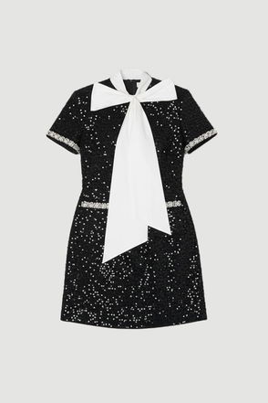 Plus Size Tailored Sequin Tweed Tie Bow Neck Embellished Mini Dress