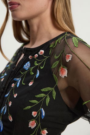 Placed Floral Embroidered Mesh Woven Belted Maxi Dress