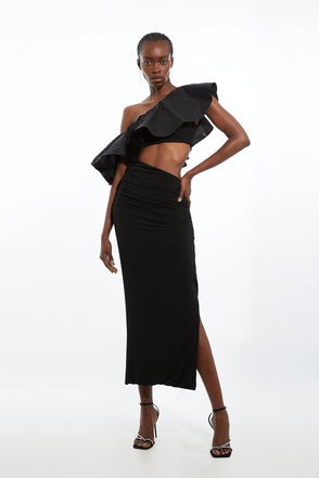 Drama Ruffle Tuxedo Tailored Pencil Maxi Dress
