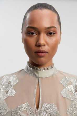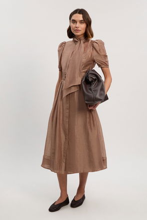 Crystal Embellished Organdie Balloon Sleeve Midi Dress