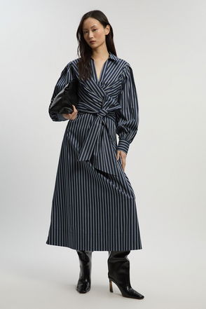 Stripe Cotton Poplin Drama Sleeve Woven Wrap Detail Shirt Dress