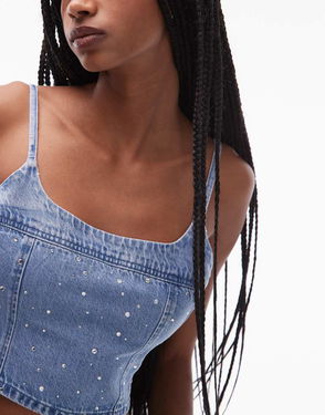 Jadine Denim Corset Cami With All Over Embellishment In Blue