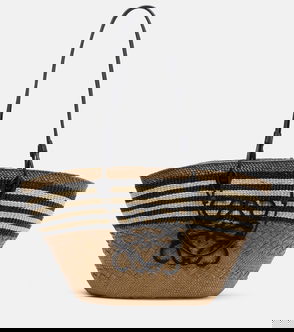 X Paula's Ibiza Anagram Striped Medium Iraca Palm And Leather Basket Bag