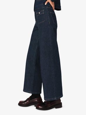 Leather-Pocket Wide-Leg High-Rise Stretch-Denim Jeans