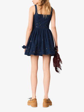 Round-Neck Flared-Skirt Stretch-Denim Mini Dress