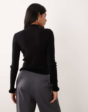 Wool Mix High Neck Frill Edge Knitted Top In Black