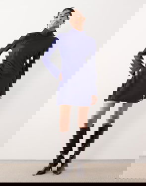 High Neck Satin Long Sleeve Ruched Side Mini Dress In Electric Blue