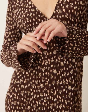 V Neck Long Sleeve Plisse Midi Dress In Brown Ditsy Floral Print