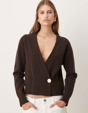 Compact Knit Wrap Waist Cardigan With Gold Button In Brown