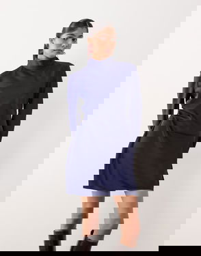 High Neck Satin Long Sleeve Ruched Side Mini Dress In Electric Blue