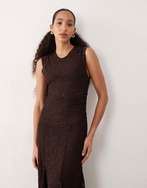 Lace Sleeveless Asymmetric Hem Maxi Dress In Chocolate