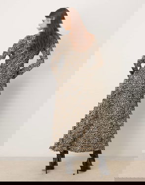 V Neck Long Sleeve Plisse Midi Dress In Leopard Print