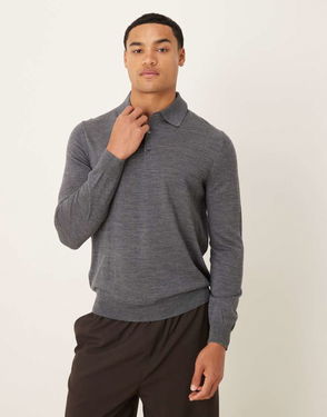 Wool Button Up Long Sleeve Knitted Polo Top In Charcoal
