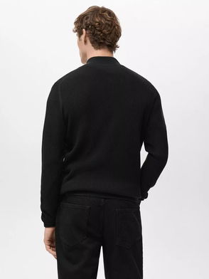 Cotton Knit Collar Zip-Through Cardigan, Black