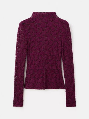 Wool Mix High Neck Frill Edge Knitted Top In Burgundy
