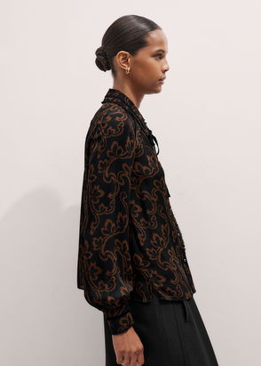 Silk Floral Scroll Print Shirt + Tie Black/Brown