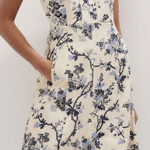 Cotton Modern Botanical Print Midi Dress Light Cream/Blue/Multi