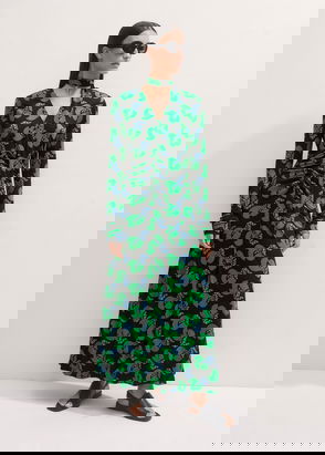 Crepe Birds Of Paradise Maxi Dress + Belt Navy/Clover Green/Blue