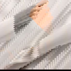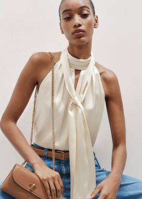 Silk Topstitched High Neck Blouse + Tie Light Cream