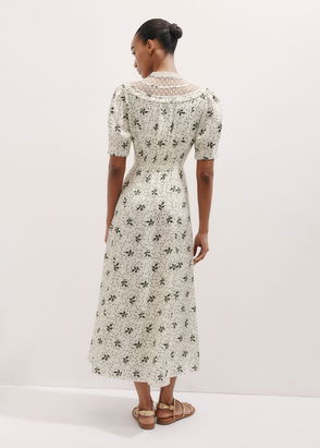 Silk-Blend Swirling Leaf Print Midi Tea Dress Light Cream/Green