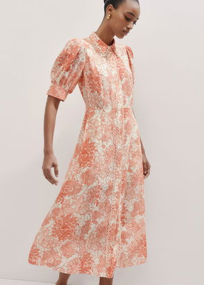 Linen-Blend Wild Bloom Print Midi Dress Light Cream/Peach/Multi