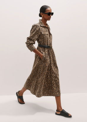 Linen-Blend Stencil Meadow Print Midi Dress + Belt Light Cream/Peach