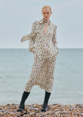Silk Scattered Floral Print Midi Dress Rum Raisin/Fresh Lavender