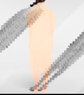 Knitted Midi Dress With Fringed Neckline And Hem In Metallic Grey