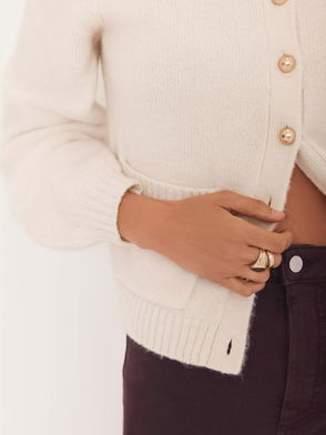Ribbed Trim Crew Neck Cardigan, Cream