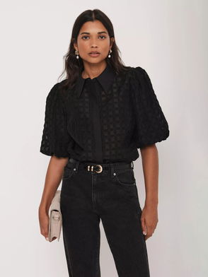 Puff Sleeve Petal Detail Shirt, Black