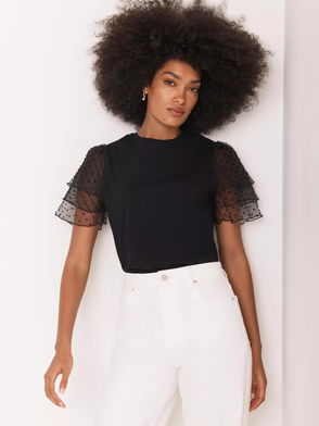 Spot Tulle Sleeve T-Shirt, Black