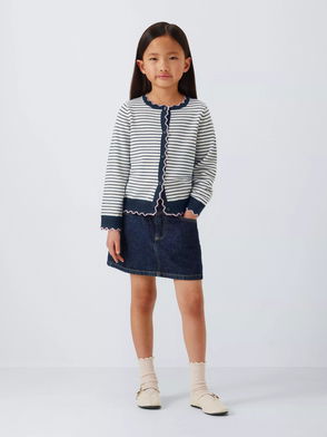 Kids' Crew Neck Stripe Scallop Trim Cardigan, White/Black