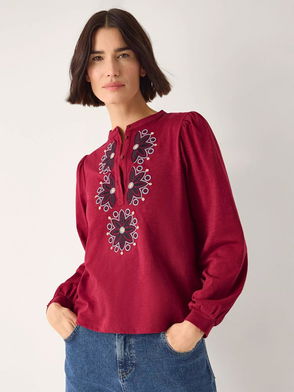 Esme Embroidered Jersey Blouse, Burgundy