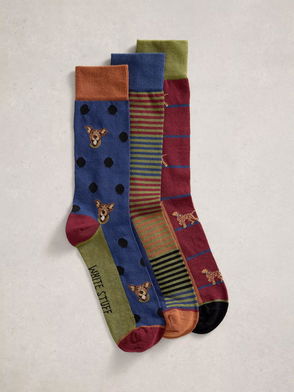 Dog & Stripe Socks, Pack Of 3, Brown/Multi