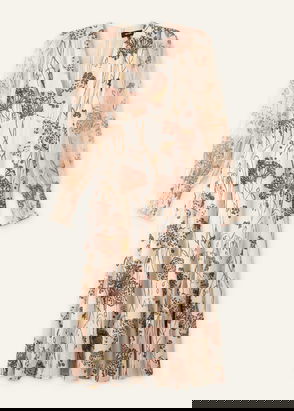 Linen-Blend Wild Bloom Print Midi Dress Light Cream/Peach/Multi